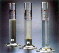 經(jīng)本機(jī)處理水質(zhì)前后對照 1號為未處理的水樣 2號為脫離后的水樣 3號為過濾后的水樣